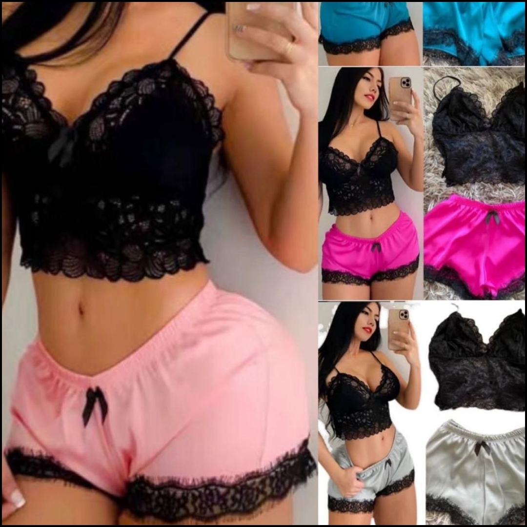 Descansa con estilo y comodidad con este conjunto de pijama de dos piezas. El set incluye un top corto y un short, ambos con detalles de encaje para un toque de sensualidad.